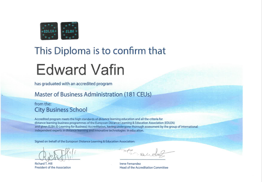В октябре 2017 года Управляющий Отделением ПФР по Республике Татарстан Эдуард Вафин завершил обучение и получил международный диплом европейской ассоциации EDLEA(European Distance Learning and Education Association) по направлению «Мастер делового администрирования – Master of Business Administration(MBA)»