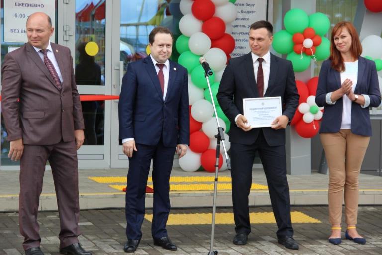 Управляющий региональным фондом торжественно перерезал красную ленту, совместно с главой исполнительного комитета района, и вручил директору одного из новых бассейнов республики сертификат на приобретения спортивного инвентаря.