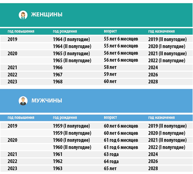 Повышение пенсионного возраста на первом этапе затронет мужчин 1959 г.р. и женщин 1964 г.р. Однако для этих граждан предусмотрен выход на пенсию на 6 месяцев раньше нового пенсионного возраста.