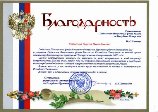 Отделение Пенсионного фонда России по Республике Бурятия сердечно благодарит Вас и коллектив Отделения Пенсионного фонда России по Республике Татарстан за теплый прием наших сотрудников во время проведения I Межрегиональной спартакиады 2010 года.