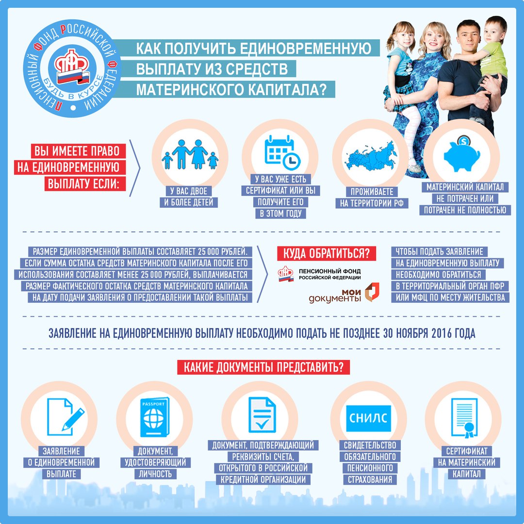 Воспользоваться правом на получение единовременной выплаты в размере 25 тыс. рублей из средств материнского капитала могут все семьи, которые получили (или получат право на материнский сертификат до 30 сентября 2016 года) и не использовали всю сумму материнского капитала на основные направления. Заявление необходимо подать не позднее 30 ноября 2016 года.