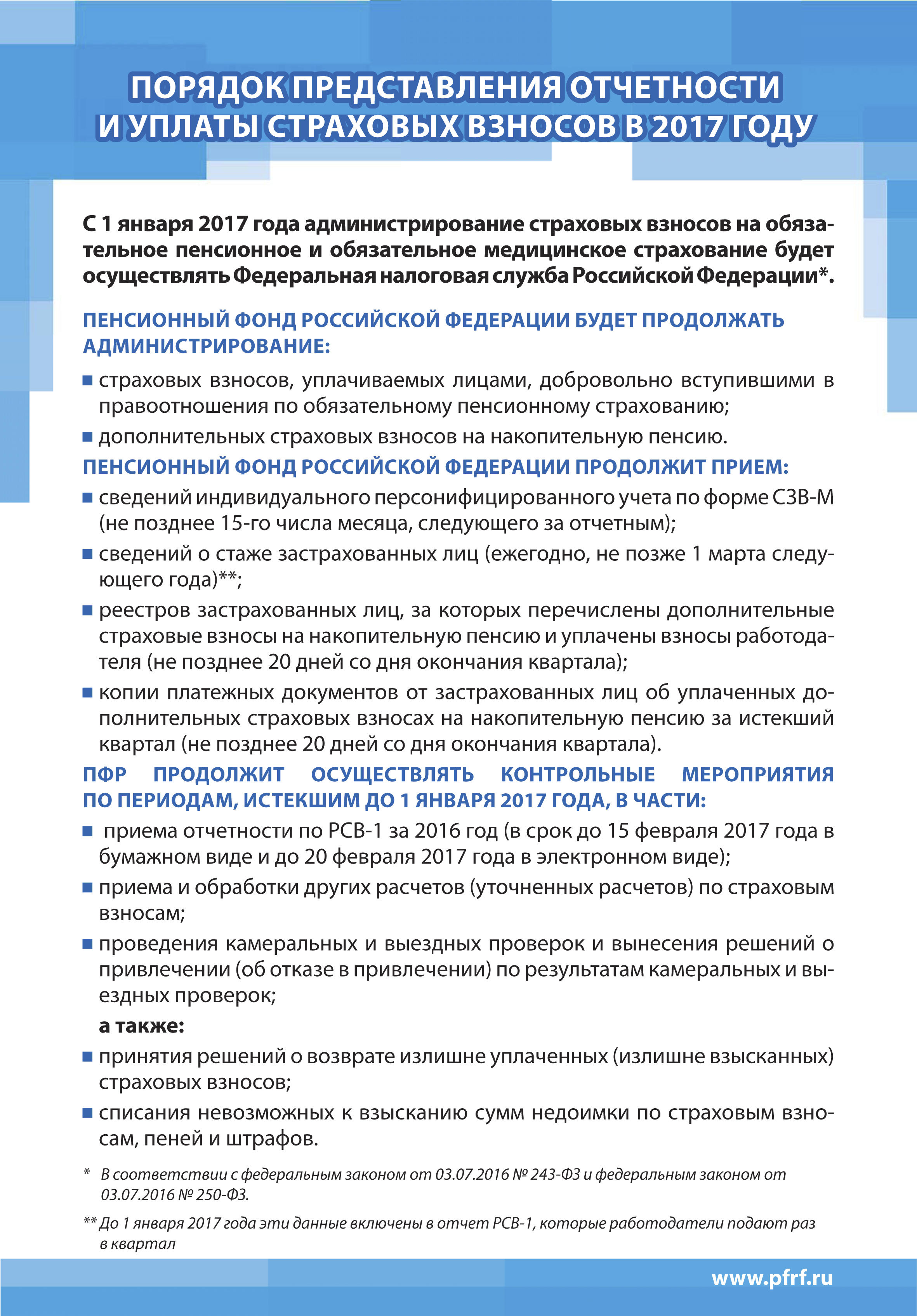 С 1 января 2017 года администрирование страховых взносов на обязательное пенсионное и медицинское страхование переходит в ведение Федеральной налоговой службы Российской Федерации. В то же время ряд функций в части администрирования останется за Пенсионным фондом России. Эти функции следующие: